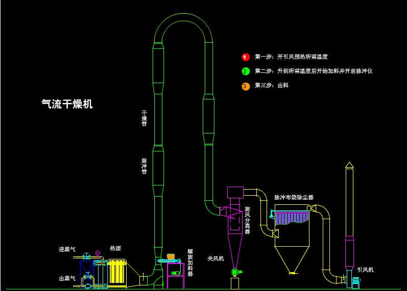 气流干燥机能从易于脱水的颗粒,粉末状物料,迅速除去水分(主要是表面水分)。在气流干燥机中,由于物料在干燥器内停留时间短,使干燥成品的品质得到^佳的控制。我厂强化型气流干燥是在基本型上增加一套转速可以无级调节的强化器组成,湿物料通过螺旋加料器进入强化器后和热气流充分混合,在飞速旋转的击刀击碎和推进下,物料被破碎成细颗粒,在干燥同时向出口移动,^后在风力吸引下进入干燥管,进一步均匀干燥。风力无法吸引的湿重颗粒继续被击碎、干燥、直至能被风吸起进入干燥管。